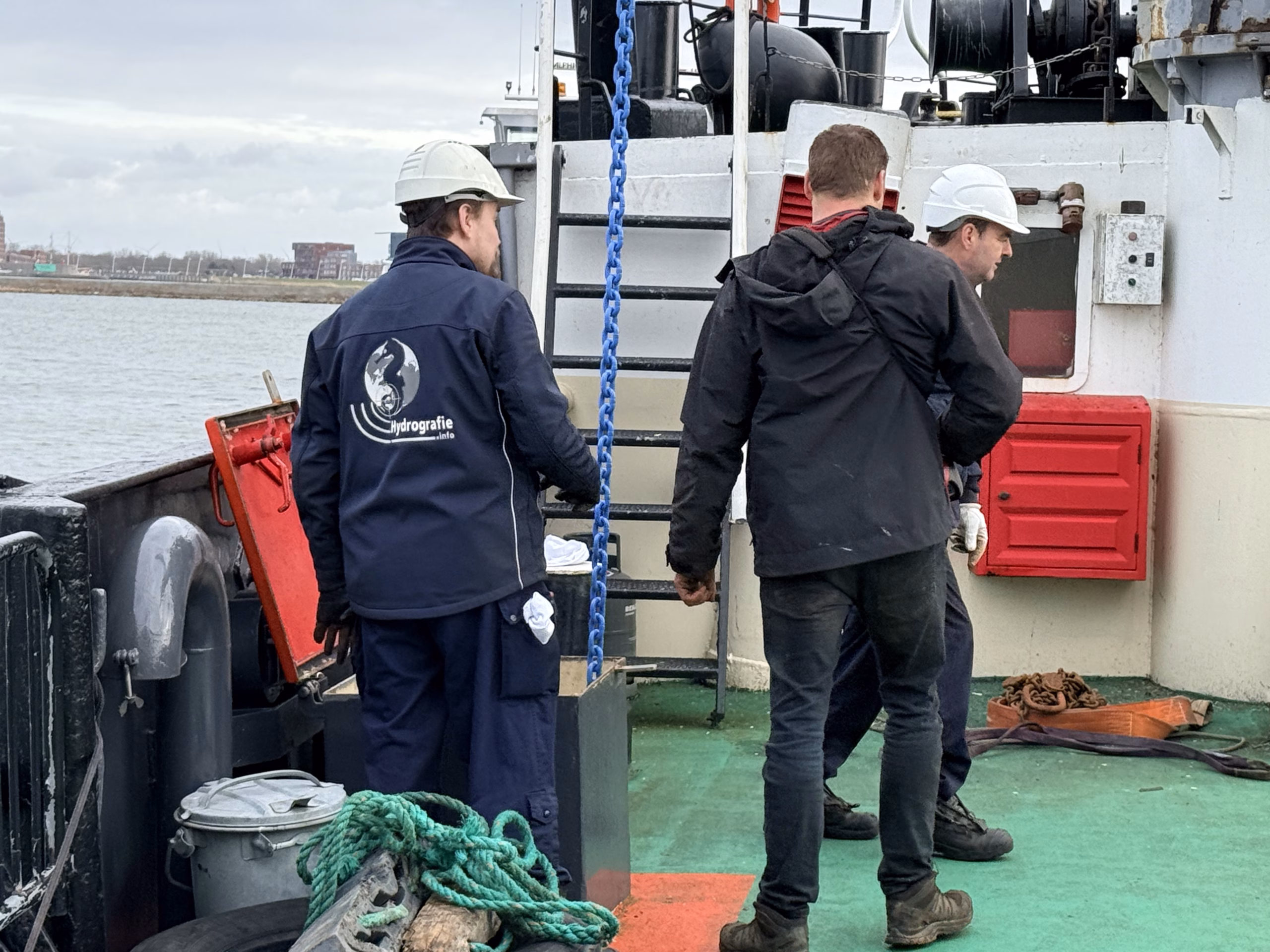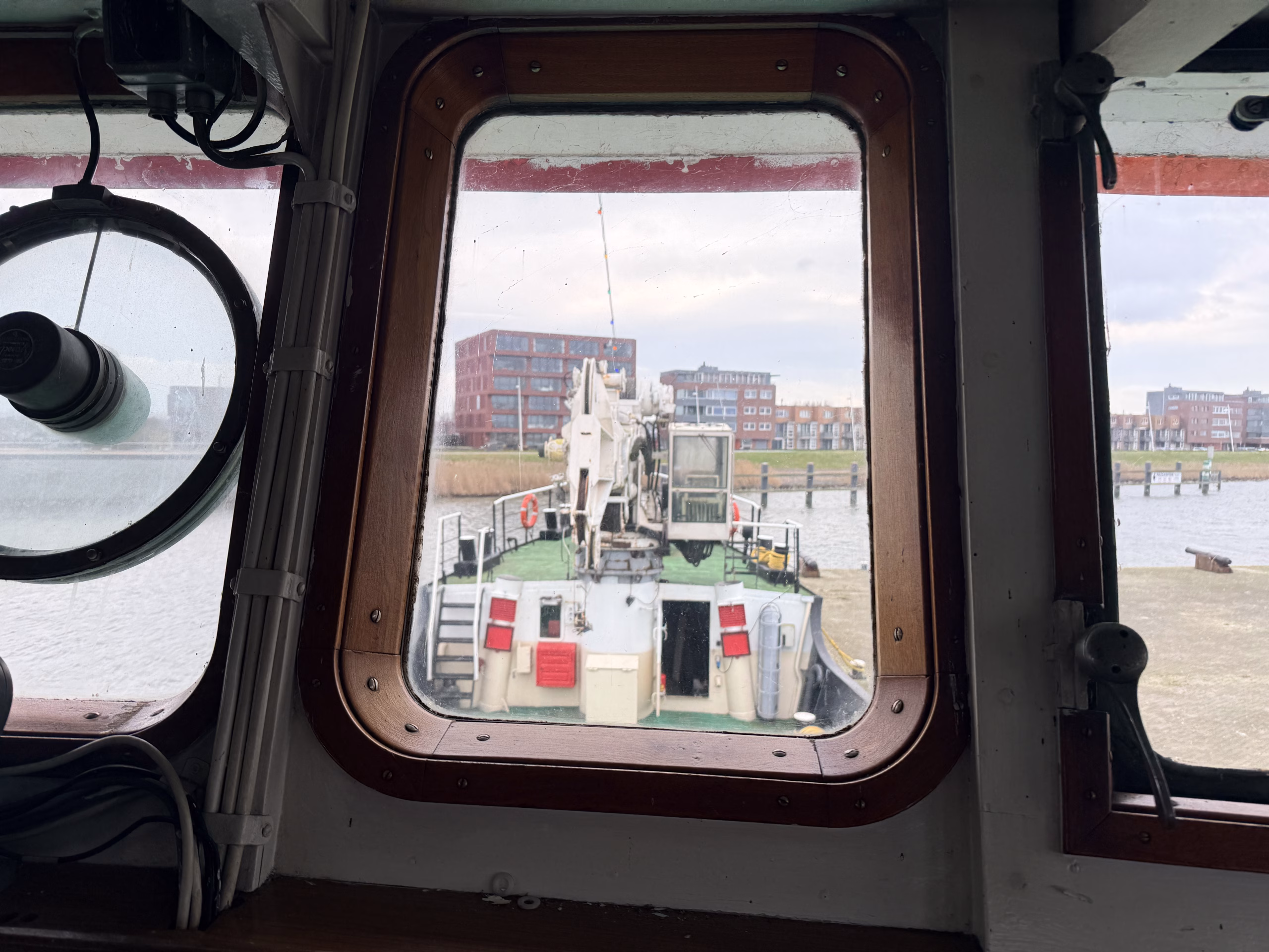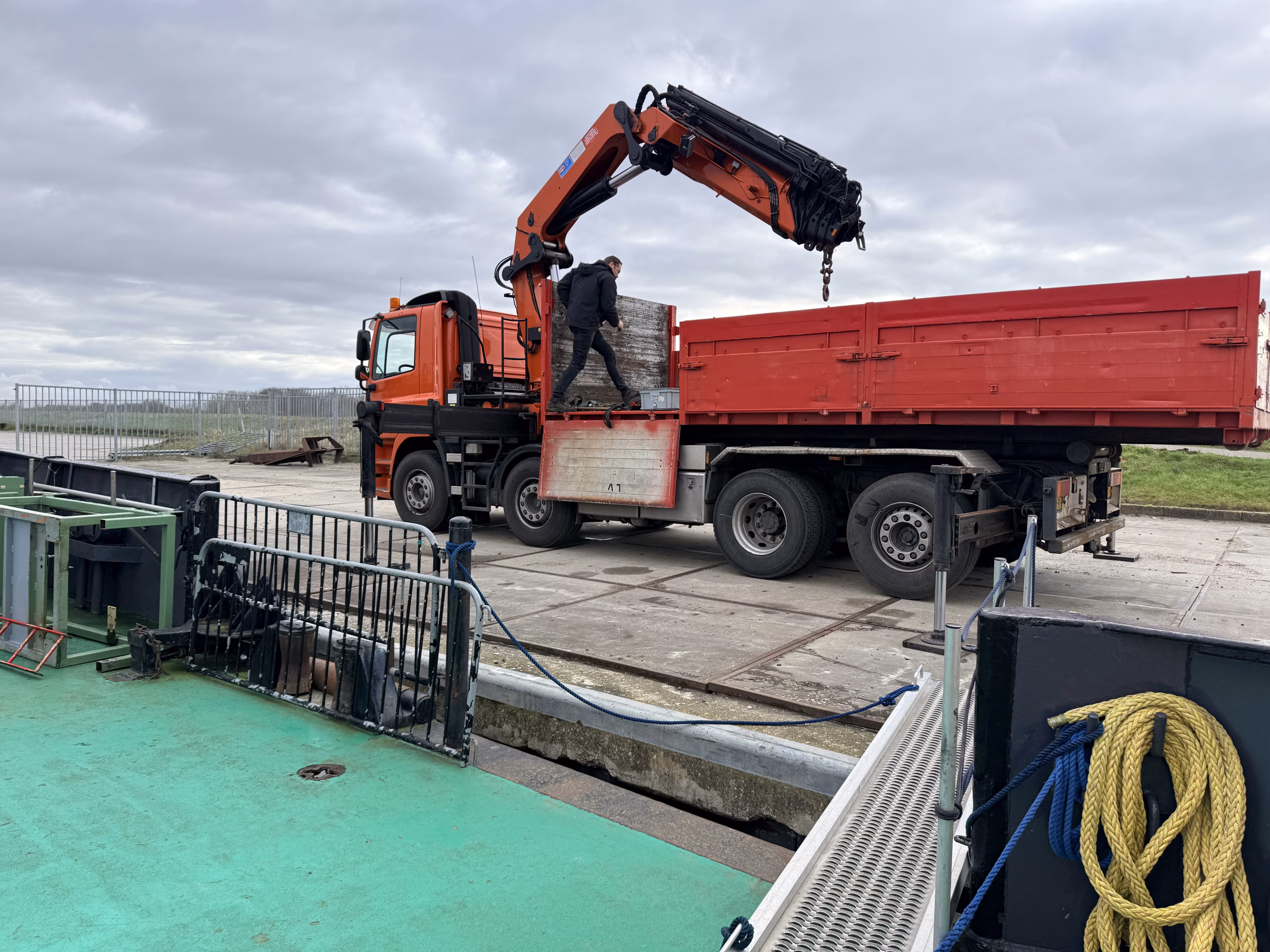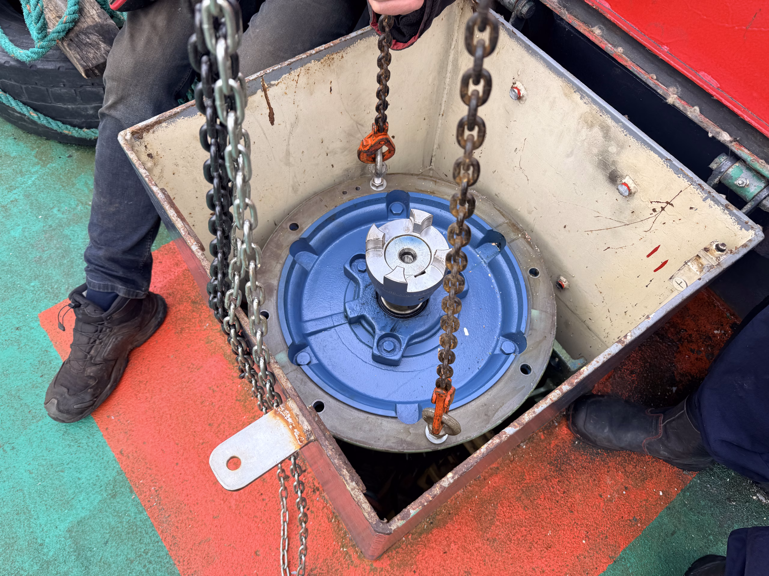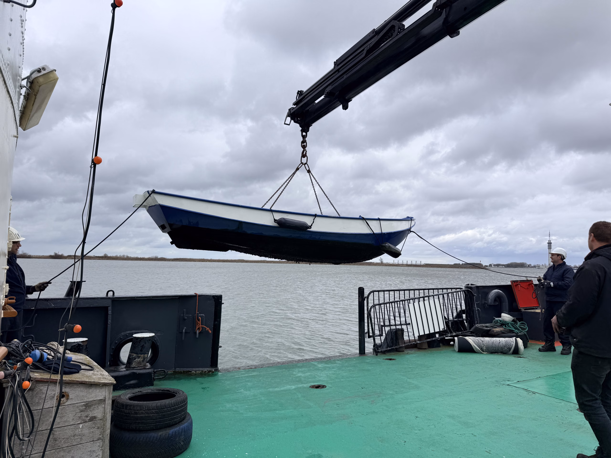 Zaterdag de 28-ste was er geen korpsdag. Maar het was voor kader en vrijwilligers zo ongeveer de drukste dag van het jaar. De grote kraan zou van het schip worden verwijderd. Zou, want door wat tegenslag kon de kraan met dieplader niet op tijd aanwezig zijn. Nu wordt dus maandag weer een drukke dag voor kaderleden en vrijwilligers. Dat neemt niet weg dat er heel veel wel is gebeurd zaterdag. De losse onderdelen zoals een amechtig zware hydrauliekpomp zijn uit het ruim getakeld en afgevoerd. Natuurlijk is ook de vlet direct maar even op het dek gezet.